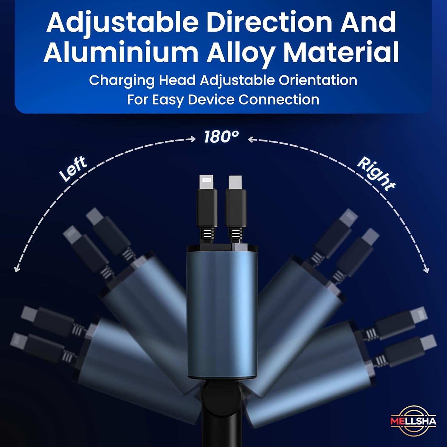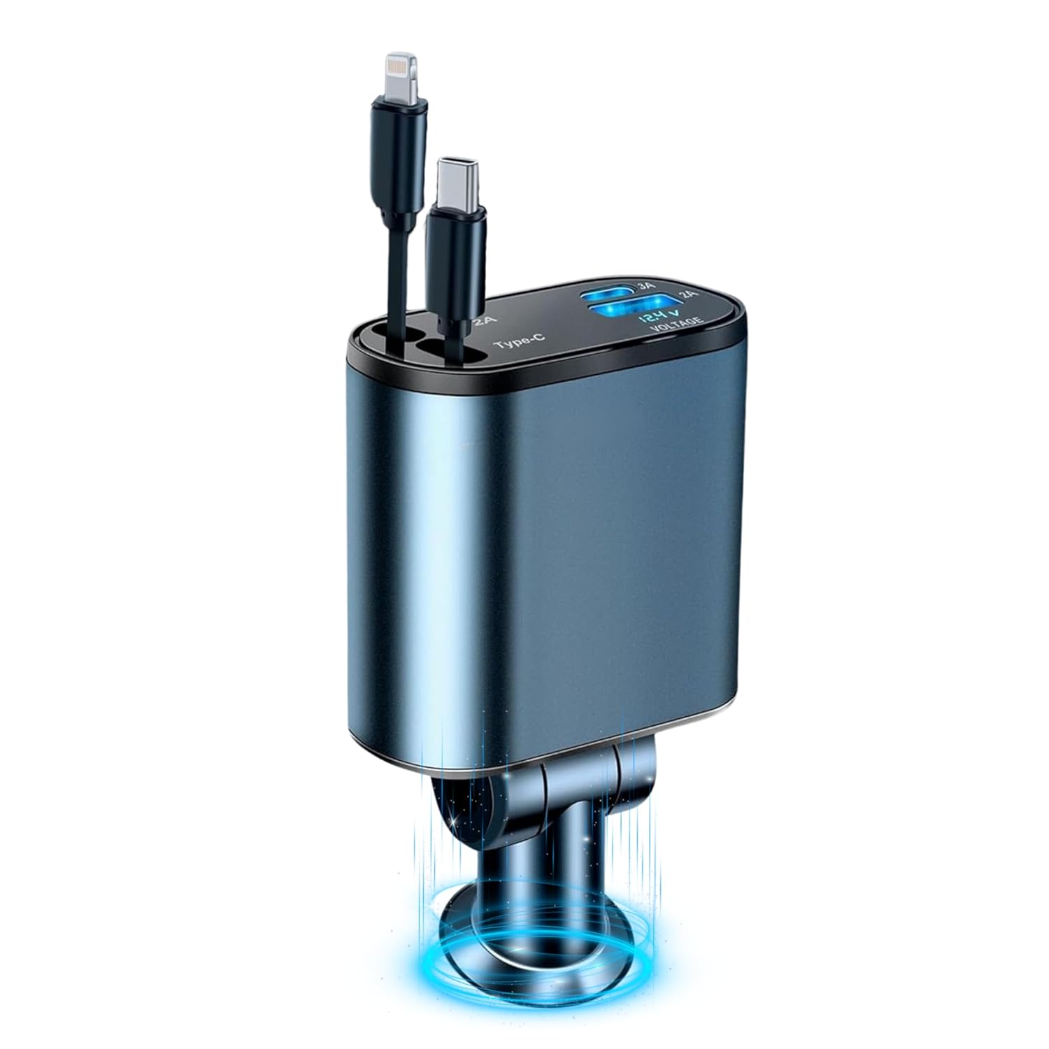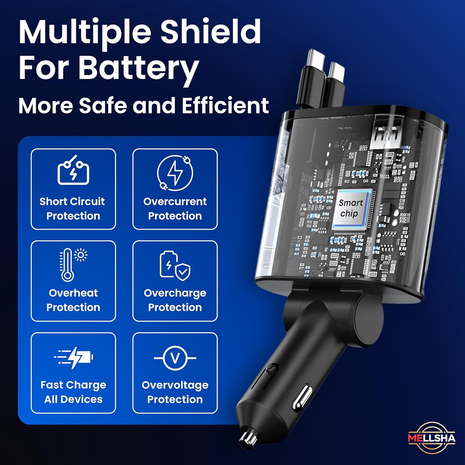 MELLSHA Retractable Car Charger, 100W 4-in-1 Super Fast Charge Car Mobile Charger, Retractable Cables (31.5 Inch) & Dual USB Ports Car Adapter for iPhone 15/14/13/12 Pro Max, iPad, Pixel – Silver